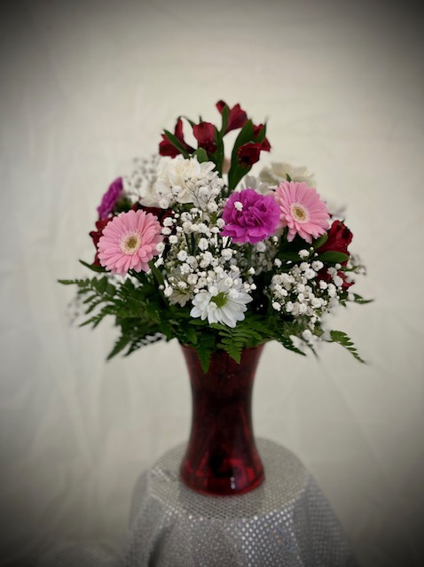 This delightful arrangement is the perfect addition to any date night. A frosted red vase holds an ample combination fo the seasons freshest flowers accented with baby’s breath and fern. Limited number available.