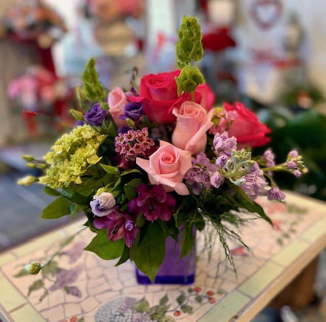 This violet glass cube is filled with fuschia and pale pink roses, green hydrangeas, Bells of Ireland, purple alstroemerias, and lavender wax flowers and snap dragons, then accented with tree fern — simply stunning and elegant!