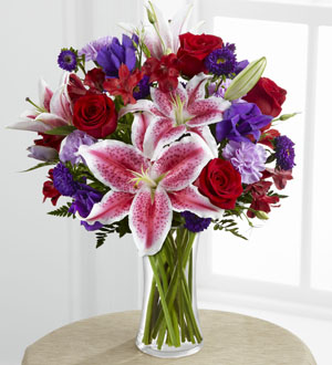 The FTD® Stunning Beauty™ Bouquet is an absolutely lovely way to send your love and affection across the miles. Fragrant Stargazer lilies stretch their star-like petals across a bed of rich red roses, lavender carnations, red Peruvian lilies, purple double lisianthus, purple matsumoto asters and lush greens. Presented in a classic clear glass vase, this elegant bouquet is an incredible way to convey your sweetest sentiments.