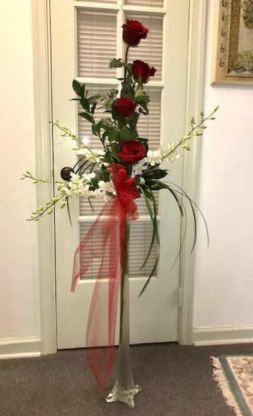 Say “I love you” with a Tower of Love. Stunning long stem crimson Explorer roses and romantic white Dendrobium orchids are set in an Eiffel Tower vase and accented with Ruscus and Lily Grass. This beautiful display stands five feet tall and makes an amazing statement of love.